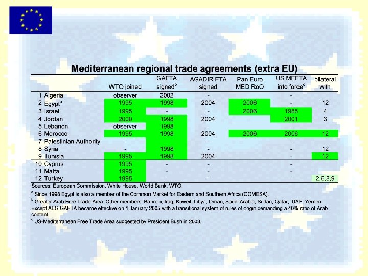 Framework developments u u u Nov. 2005 Barcelona meeting: 5 -year roadmap for tariff dismantling, market access, trade-related policies Oct. 2005 “Pan-Euro MED Protocol of Origin” adopted by Egypt, Israel and Morocco Approximation of standards, technical regulations and conformity assessments for industrial products March 2005 Marrakech meeting launched negotiations on services and investment (including right of establishment) based on AAs and GATS Art. V (without ALG, SYR) -> July Brx -> text mid -2007 Negotiations have already started with some countries on a progressive and asymmetrical agricultural liberalisation “with a possible selected number of exceptions”. Negotiations on an efficient dispute settlement mechanism. -> July Brx -> bilateral protocols by end of 2007