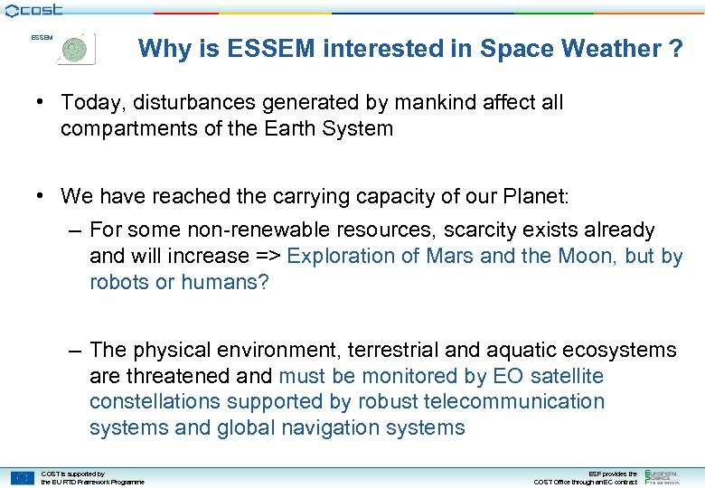 ESSEM Why is ESSEM interested in Space Weather ? • Today, disturbances generated by mankind affect all compartments of the Earth System • We have reached the carrying capacity of our Planet: – For some non-renewable resources, scarcity exists already and will increase => Exploration of Mars and the Moon, but by robots or humans? – The physical environment, terrestrial and aquatic ecosystems are threatened and must be monitored by EO satellite constellations supported by robust telecommunication systems and global navigation systems COST is supported by the EU RTD Framework Programme ESF provides the COST Office through an EC contract