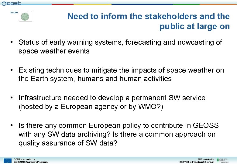 ESSEM Need to inform the stakeholders and the public at large on • Status of early warning systems, forecasting and nowcasting of space weather events • Existing techniques to mitigate the impacts of space weather on the Earth system, humans and human activities • Infrastructure needed to develop a permanent SW service (hosted by a European agency or by WMO? ) • Is there any common European policy to contribute in GEOSS with any SW data archiving? Is there a common approach on quality assurance of SW data? COST is supported by the EU RTD Framework Programme ESF provides the COST Office through an EC contract