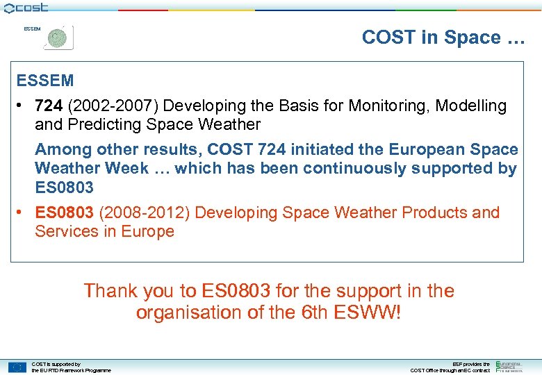 COST in Space … ESSEM • 724 (2002 -2007) Developing the Basis for Monitoring, Modelling and Predicting Space Weather Among other results, COST 724 initiated the European Space Weather Week … which has been continuously supported by ES 0803 • ES 0803 (2008 -2012) Developing Space Weather Products and Services in Europe Thank you to ES 0803 for the support in the organisation of the 6 th ESWW! COST is supported by the EU RTD Framework Programme ESF provides the COST Office through an EC contract