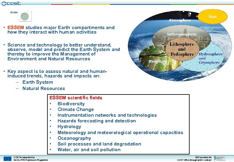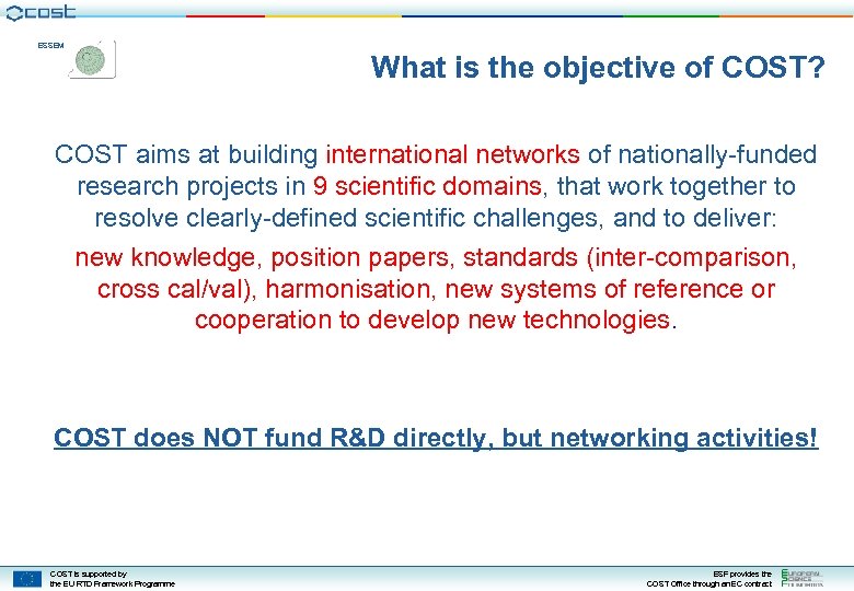 ESSEM What is the objective of COST? COST aims at building international networks of nationally-funded research projects in 9 scientific domains, that work together to resolve clearly-defined scientific challenges, and to deliver: new knowledge, position papers, standards (inter-comparison, cross cal/val), harmonisation, new systems of reference or cooperation to develop new technologies. COST does NOT fund R&D directly, but networking activities! COST is supported by the EU RTD Framework Programme ESF provides the COST Office through an EC contract