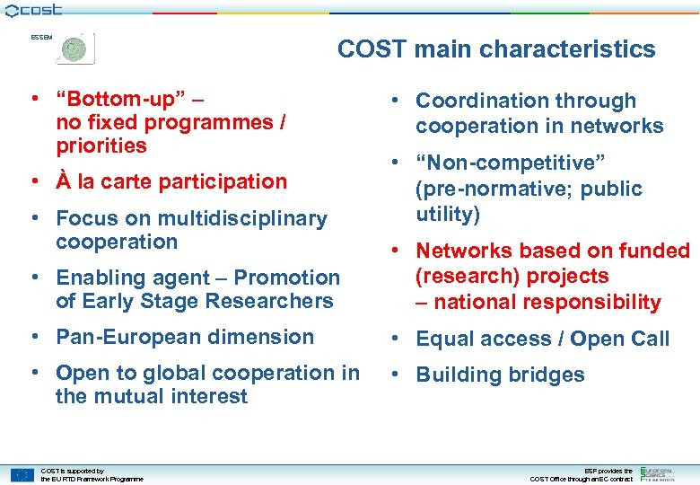 ESSEM COST main characteristics • “Bottom-up” – no fixed programmes / priorities • À la carte participation • Focus on multidisciplinary cooperation • Coordination through cooperation in networks • “Non-competitive” (pre-normative; public utility) • Enabling agent – Promotion of Early Stage Researchers • Networks based on funded (research) projects – national responsibility • Pan-European dimension • Equal access / Open Call • Open to global cooperation in the mutual interest • Building bridges COST is supported by the EU RTD Framework Programme ESF provides the COST Office through an EC contract