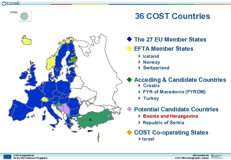 ESSEM 36 COST Countries The 27 EU Member States EFTA Member States Iceland Norway Switzerland Acceding & Candidate Countries Croatia FYR of Macedonia (FYROM) Turkey Potential Candidate Countries Bosnia and Herzegovina Republic of Serbia COST Co-operating States Israel COST is supported by the EU RTD Framework Programme ESF provides the COST Office through an EC contract