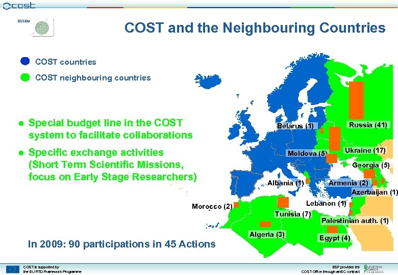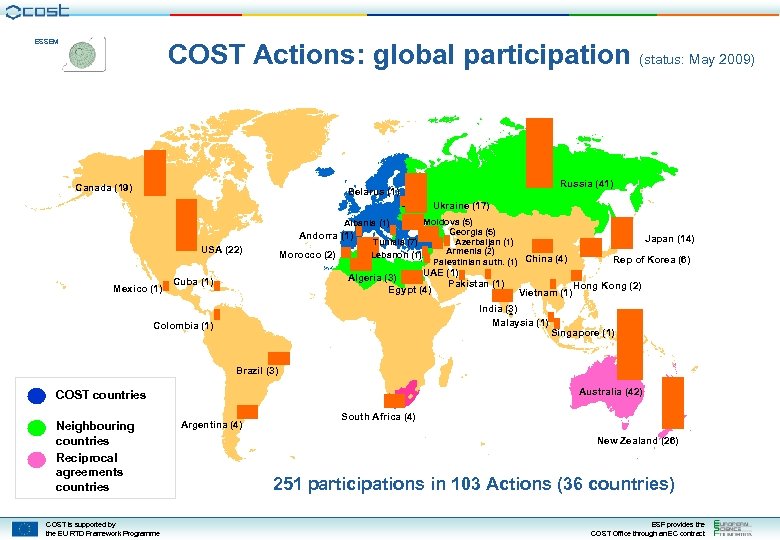 ESSEM COST Actions: global participation (status: May 2009) Canada (19) Russia (41) Belarus (1) BELARUS Ukraine (17) Moldova (5) Georgia (5) Azerbaijan (1) Tunisia (7) Armenia (2) Lebanon (1) Palestinian auth. (1) China (4) Albania (1) Andorra (1) USA (22) Japan (14) GEORGIA Morocco (2) TUNISIA ALGERIA UAE (1) Algeria (3) Pakistan (1) Egypt (4) Rep of Korea (6) EGYPT Mexico (1) Cuba (1) Vietnam (1) India (3) Malaysia (1) Hong Kong (2) SRI LANKA Colombia (1) MALAYSIA Singapore (1) PAPUA NEW GUINEA Brazil (3) Australia (42) COST countries Neighbouring countries Reciprocal agreements countries COST is supported by the EU RTD Framework Programme Argentina (4) South Africa (4) New Zealand (26) 251 participations in 103 Actions (36 countries) ESF provides the COST Office through an EC contract