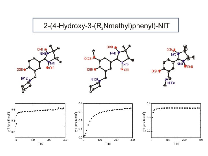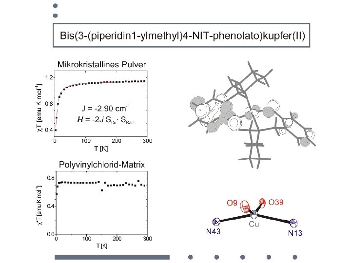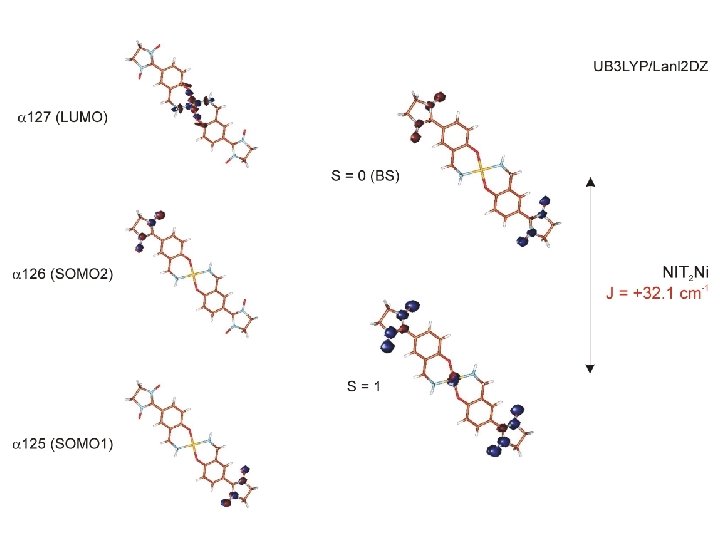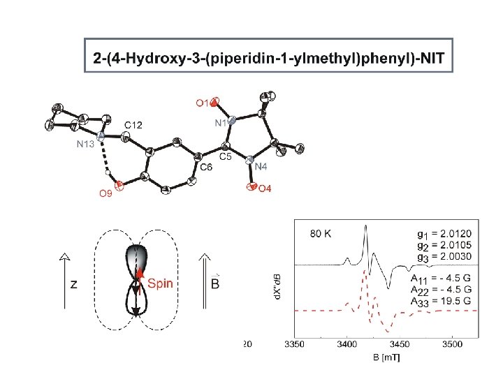 Ni 2+: d 8 dx 2 -y 2, dz 2 dxy, dxz , dyz octahedral coord. with axial CH 3 OH Ni ( S = 1 ) + 2 NIT (S=1/2) Planar quadratic coord. Ni ( S = 0 ) + (S=1) d x 2 -y 2 dz 2 dxy dxz , dyz