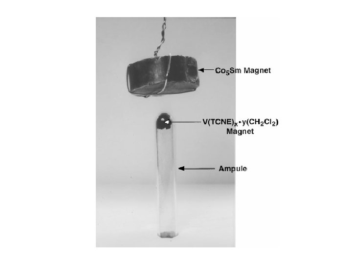J. M. Manriquez, G. T. Yee, R. S. Mc. Lean, A. J. Epstein, J. S. Miller, Science 252 (1991) 1415. V(TCNE)x · y(CH 2 Cl 2) J. Zhang, P. Zhou, W. B. Brinckerhoff, A. J. Epstein, C. Vazquez, R. S. Mc. Lean, J. S. Miller, Am. Chem. Soc. Symp. Ser. 644 (1996) 311. by reaction of V 0(CO)6 with TCNE V(TCNE)x · y(CH 2 Cl 2) (x 2; y 1/2) is the first example of an organic-based material with a critical temperature exceeding room temperature.
