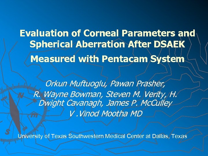 Evaluation of Corneal Parameters and Spherical Aberration After DSAEK Measured with Pentacam System Orkun Muftuoglu, Pawan Prasher, R. Wayne Bowman, Steven M. Verity, H. Dwight Cavanagh, James P. Mc. Culley V. Vinod Mootha MD University of Texas Southwestern Medical Center at Dallas, Texas