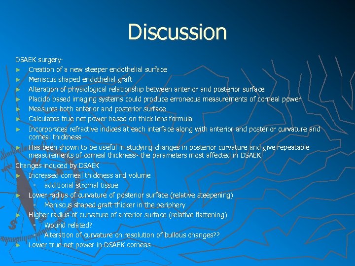 Discussion DSAEK surgery► Creation of a new steeper endothelial surface ► Meniscus shaped endothelial graft ► Alteration of physiological relationship between anterior and posterior surface ► Placido based imaging systems could produce erroneous measurements of corneal power ► Measures both anterior and posterior surface ► Calculates true net power based on thick lens formula ► Incorporates refractive indices at each interface along with anterior and posterior curvature and corneal thickness ► Has been shown to be useful in studying changes in posterior curvature and give repeatable measurements of corneal thickness- the parameters most affected in DSAEK Changes induced by DSAEK ► Increased corneal thickness and volume § additional stromal tissue ► Lower radius of curvature of posterior surface (relative steepening) § Meniscus shaped graft thicker in the periphery ► Higher radius of curvature of anterior surface (relative flattening) § Wound related? § Alteration of curvature on resolution of bullous changes? ? ► Lower true net power in DSAEK corneas