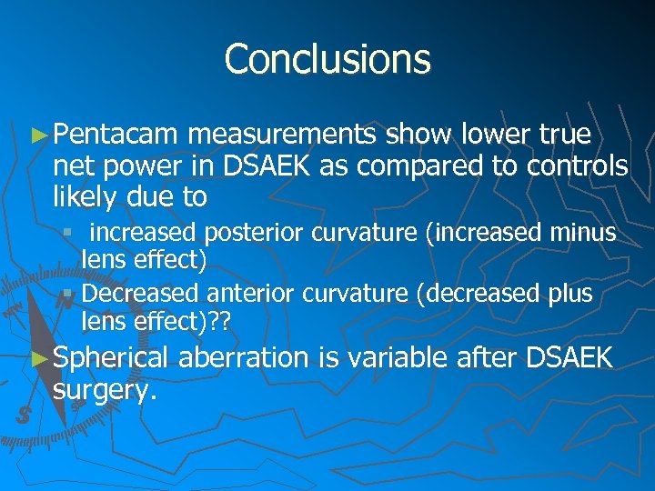Conclusions ► Pentacam measurements show lower true net power in DSAEK as compared to controls likely due to § increased posterior curvature (increased minus lens effect) § Decreased anterior curvature (decreased plus lens effect)? ? ► Spherical surgery. aberration is variable after DSAEK