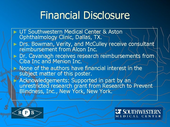 Financial Disclosure ► ► ► UT Southwestern Medical Center & Aston Ophthalmology Clinic, Dallas, TX. Drs. Bowman, Verity, and Mc. Culley receive consultant reimbursement from Alcon Inc. Dr. Cavanagh receives research reimbursements from Ciba Inc and Menion Inc. None of the authors have financial interest in the subject matter of this poster. Acknowledgements: Supported in part by an unrestricted research grant from Research to Prevent Blindness, Inc. , New York.
