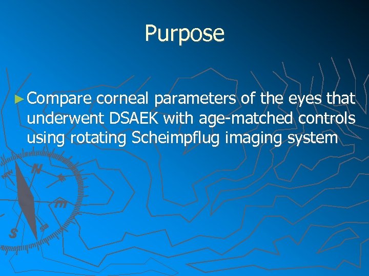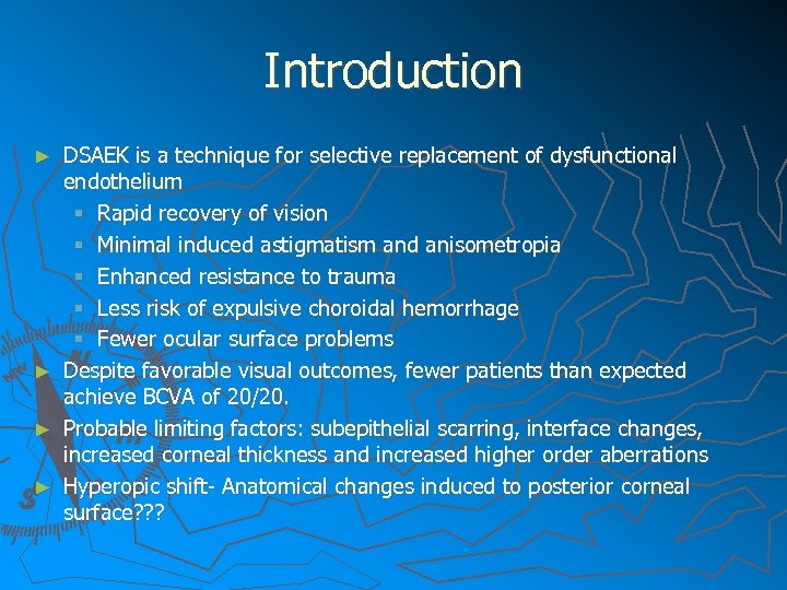 Introduction ► ► DSAEK is a technique for selective replacement of dysfunctional endothelium § Rapid recovery of vision § Minimal induced astigmatism and anisometropia § Enhanced resistance to trauma § Less risk of expulsive choroidal hemorrhage § Fewer ocular surface problems Despite favorable visual outcomes, fewer patients than expected achieve BCVA of 20/20. Probable limiting factors: subepithelial scarring, interface changes, increased corneal thickness and increased higher order aberrations Hyperopic shift- Anatomical changes induced to posterior corneal surface? ? ?
