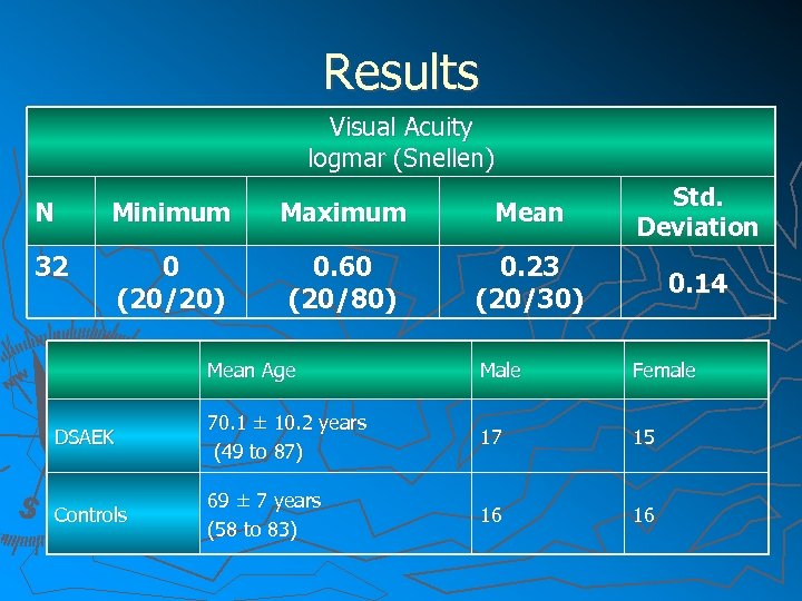 Results Visual Acuity logmar (Snellen) N Minimum Maximum Mean Std. Deviation 32 0 (20/20) 0. 60 (20/80) 0. 23 (20/30) 0. 14 Mean Age Male Female DSAEK 70. 1 ± 10. 2 years (49 to 87) 17 15 Controls 69 ± 7 years (58 to 83) 16 16