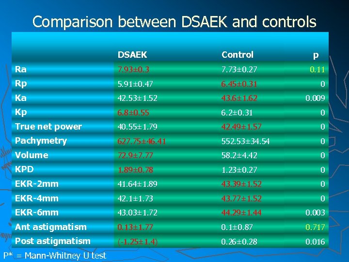 Comparison between DSAEK and controls DSAEK Control p Ra 7. 93± 0. 3 7. 73± 0. 27 0. 11 Rp 5. 91± 0. 47 6. 45± 0. 31 0 Ka 42. 53± 1. 52 43. 6± 1. 62 0. 009 Kp 6. 8± 0. 55 6. 2± 0. 31 0 True net power 40. 55± 1. 79 42. 49± 1. 57 0 Pachymetry 627. 75± 46. 41 552. 53± 34. 54 0 Volume 72. 9± 7. 77 58. 2± 4. 42 0 KPD 1. 89± 0. 78 1. 23± 0. 27 0 EKR-2 mm 41. 64± 1. 89 43. 39± 1. 52 0 EKR-4 mm 42. 1± 1. 73 43. 77± 1. 52 0 EKR-6 mm 43. 03± 1. 72 44. 29± 1. 44 0. 003 Ant astigmatism 0. 13± 1. 77 0. 1± 0. 87 0. 717 Post astigmatism (-1. 25± 1. 4) 0. 26± 0. 28 0. 016 P* = Mann-Whitney U test