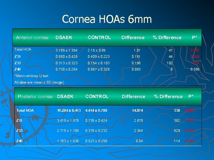 Cornea HOAs 6 mm Anterior cornea DSAEK CONTROL Total HOA 3. 165 ± 1. 354 2. 15 ± 0. 65 Z 31 0. 590 ± 0. 426 Z 33 Z 40 Difference % Difference P* 1. 01 47 0. 001 0. 409 ± 0. 223 0. 181 44 0. 045 0. 313 ± 0. 323 0. 154 ± 0. 103 0. 158 102 0. 01 0. 730 ± 0. 264 0. 667 ± 0. 326 0. 063 9 0. 398 *Mann-whitney U test Mann- whitney U test All data are mean ± SD (range) Posterior cornea DSAEK CONTROL Difference % Difference P* Total HOA 19. 284 ± 8. 413 4. 414 ± 0. 788 14. 874 338 <0. 001 Z 31 3. 419 ± 1. 875 0. 739 ± 0. 424 2. 679 362 <0. 001 Z 33 2. 719 ± 1. 765 0. 375 ± 0. 232 2. 344 625 <0. 001 Z 40 1. 763 ± 1. 430 0. 823 ± 0. 296 0. 94 114 <0. 001