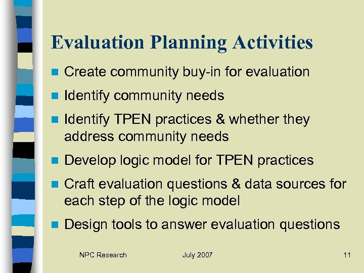 Evaluation Planning Activities n Create community buy-in for evaluation n Identify community needs n Identify TPEN practices & whether they address community needs n Develop logic model for TPEN practices n Craft evaluation questions & data sources for each step of the logic model n Design tools to answer evaluation questions NPC Research July 2007 11