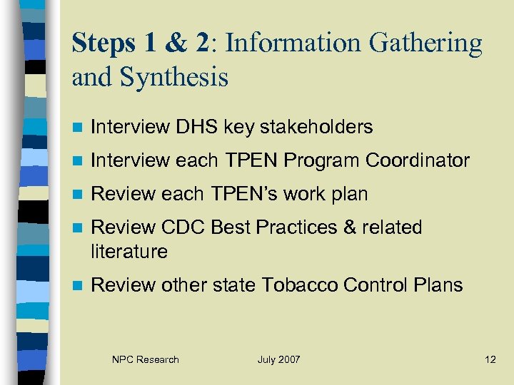Steps 1 & 2: Information Gathering and Synthesis n Interview DHS key stakeholders n Interview each TPEN Program Coordinator n Review each TPEN’s work plan n Review CDC Best Practices & related literature n Review other state Tobacco Control Plans NPC Research July 2007 12