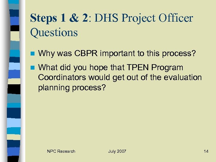 Steps 1 & 2: TPEN Program Coordinator Questions n What was your initial reaction to the idea of evaluation planning? n Did you have any concerns? n Was there anything about evaluation that you were particularly interested in? NPC Research July 2007 13