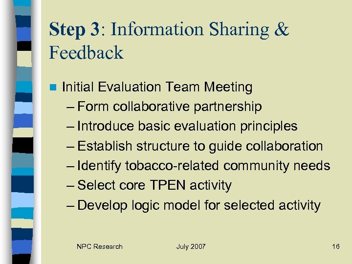 Step 3: Information Sharing & Feedback n Pre-planning meeting – Statement of purpose – Logistics – Review preliminary logic model – Recruitment NPC Research July 2007 15