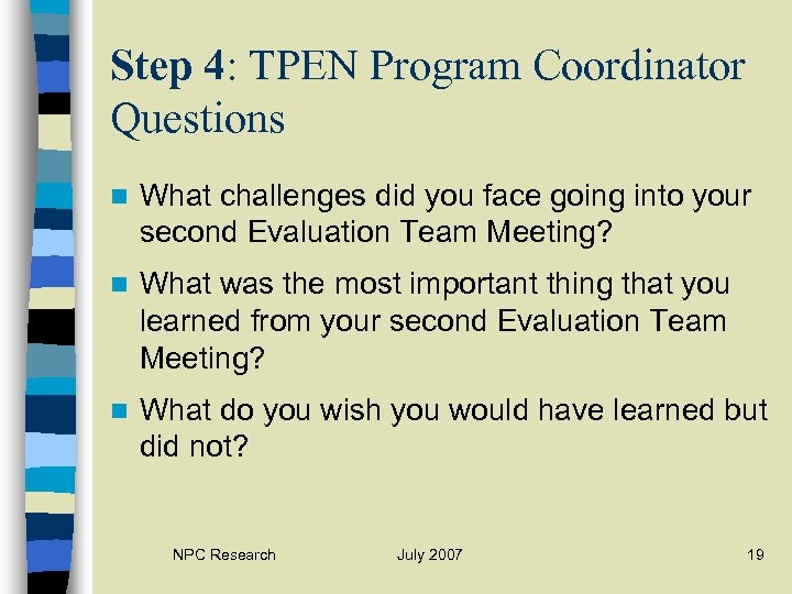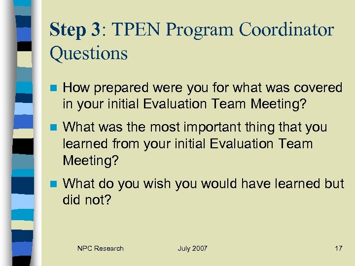 Step 3: TPEN Program Coordinator Questions n How prepared were you for what was covered in your initial Evaluation Team Meeting? n What was the most important thing that you learned from your initial Evaluation Team Meeting? n What do you wish you would have learned but did not? NPC Research July 2007 17