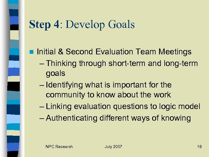 Step 4: Develop Goals n Initial & Second Evaluation Team Meetings – Thinking through short-term and long-term goals – Identifying what is important for the community to know about the work – Linking evaluation questions to logic model – Authenticating different ways of knowing NPC Research July 2007 18