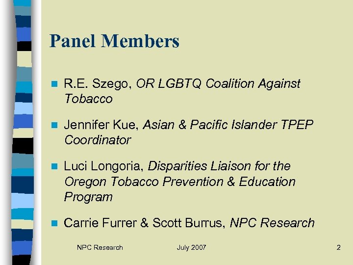 Panel Members n R. E. Szego, OR LGBTQ Coalition Against Tobacco n Jennifer Kue, Asian & Pacific Islander TPEP Coordinator n Luci Longoria, Disparities Liaison for the Oregon Tobacco Prevention & Education Program n Carrie Furrer & Scott Burrus, NPC Research July 2007 2