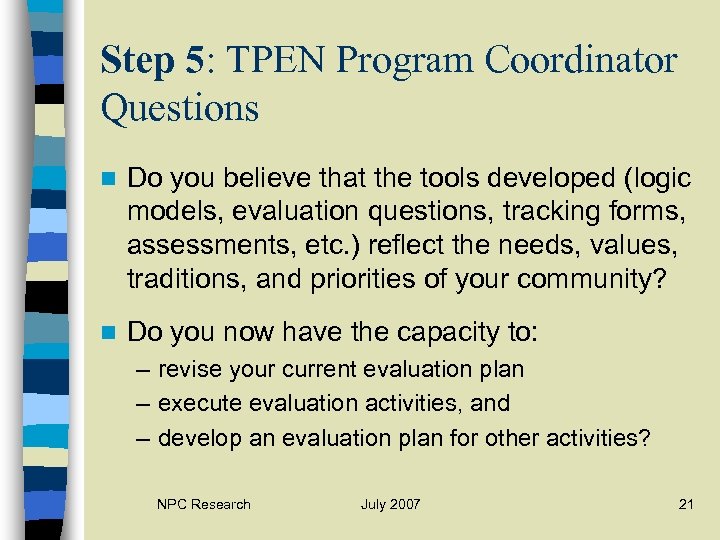 Step 5: TPEN Program Coordinator Questions n Do you believe that the tools developed (logic models, evaluation questions, tracking forms, assessments, etc. ) reflect the needs, values, traditions, and priorities of your community? n Do you now have the capacity to: – revise your current evaluation plan – execute evaluation activities, and – develop an evaluation plan for other activities? NPC Research July 2007 21