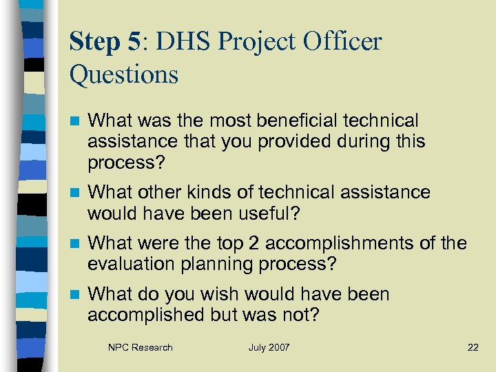 Step 5: DHS Project Officer Questions n What was the most beneficial technical assistance that you provided during this process? n What other kinds of technical assistance would have been useful? n What were the top 2 accomplishments of the evaluation planning process? n What do you wish would have been accomplished but was not? NPC Research July 2007 22