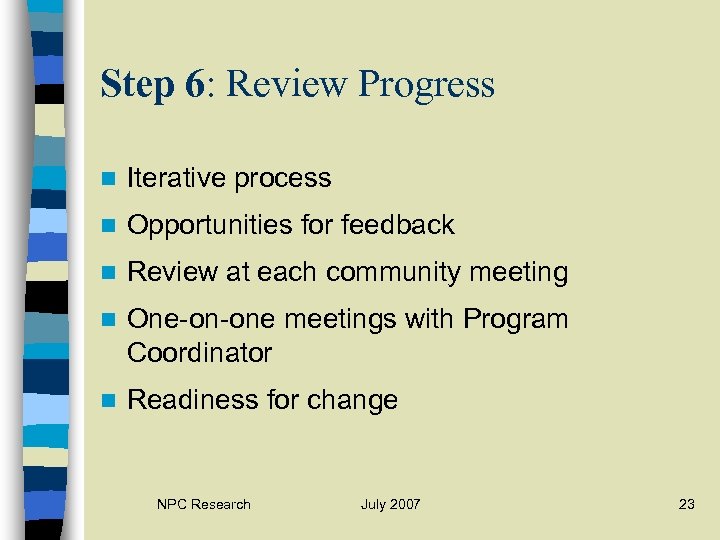 Step 6: Review Progress n Iterative process n Opportunities for feedback n Review at each community meeting n One-on-one meetings with Program Coordinator n Readiness for change NPC Research July 2007 23
