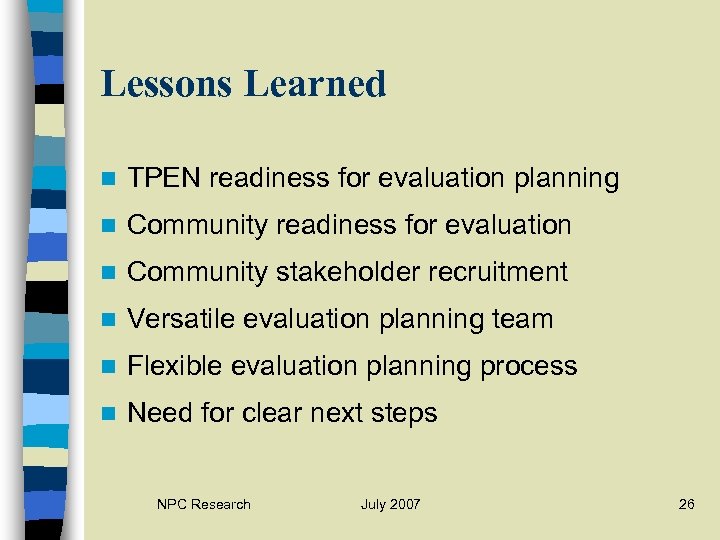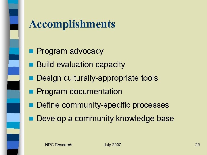 Accomplishments n Program advocacy n Build evaluation capacity n Design culturally-appropriate tools n Program documentation n Define community-specific processes n Develop a community knowledge base NPC Research July 2007 25