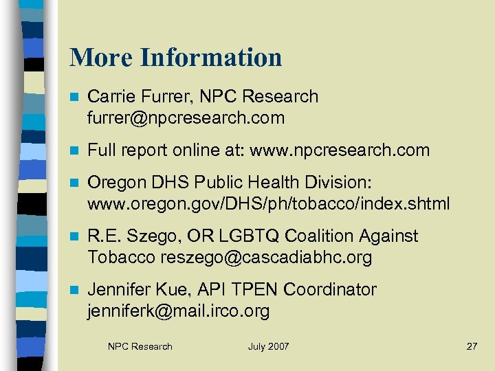 More Information n Carrie Furrer, NPC Research furrer@npcresearch. com n Full report online at: www. npcresearch. com n Oregon DHS Public Health Division: www. oregon. gov/DHS/ph/tobacco/index. shtml n R. E. Szego, OR LGBTQ Coalition Against Tobacco reszego@cascadiabhc. org n Jennifer Kue, API TPEN Coordinator jenniferk@mail. irco. org NPC Research July 2007 27