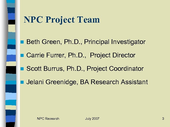 NPC Project Team n Beth Green, Ph. D. , Principal Investigator n Carrie Furrer, Ph. D. , Project Director n Scott Burrus, Ph. D. , Project Coordinator n Jelani Greenidge, BA Research Assistant NPC Research July 2007 3