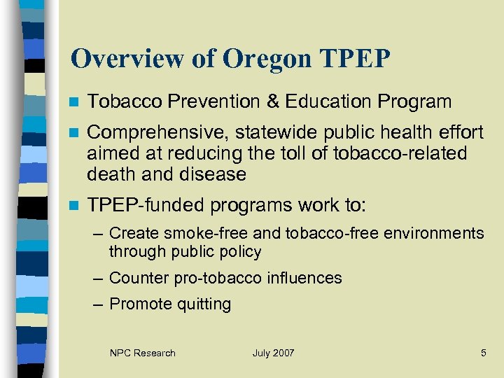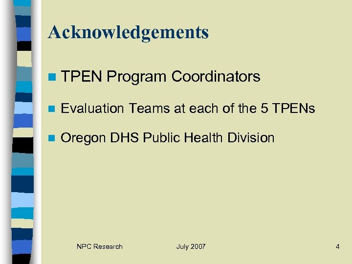 Acknowledgements n TPEN Program Coordinators n Evaluation Teams at each of the 5 TPENs n Oregon DHS Public Health Division NPC Research July 2007 4