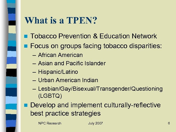 What is a TPEN? Tobacco Prevention & Education Network n Focus on groups facing tobacco disparities: n – – – n African American Asian and Pacific Islander Hispanic/Latino Urban American Indian Lesbian/Gay/Bisexual/Transgender/Questioning (LGBTQ) Develop and implement culturally-reflective best practice strategies NPC Research July 2007 6