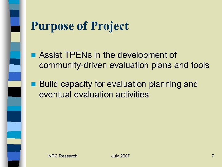 Purpose of Project n Assist TPENs in the development of community-driven evaluation plans and tools n Build capacity for evaluation planning and eventual evaluation activities NPC Research July 2007 7