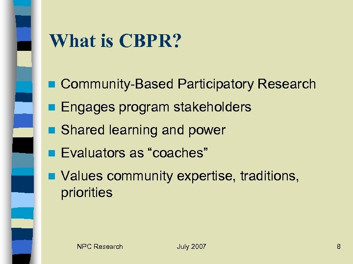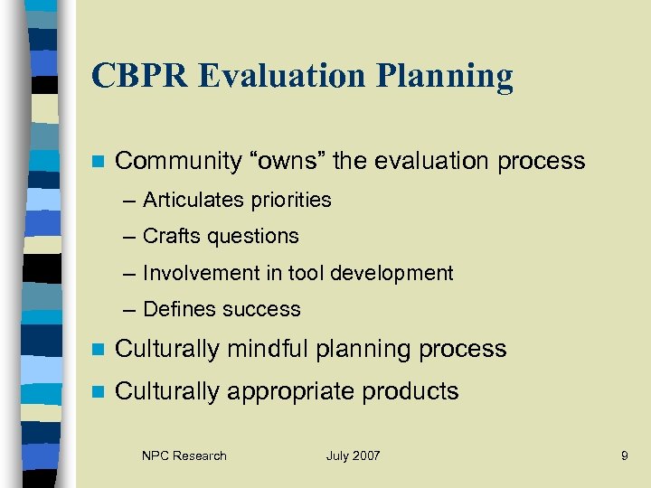 What is CBPR? n Community-Based Participatory Research n Engages program stakeholders n Shared learning and power n Evaluators as “coaches” n Values community expertise, traditions, priorities NPC Research July 2007 8