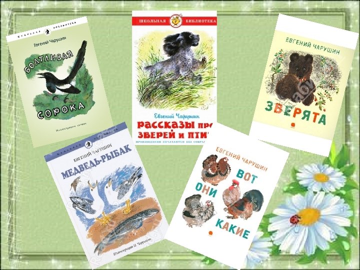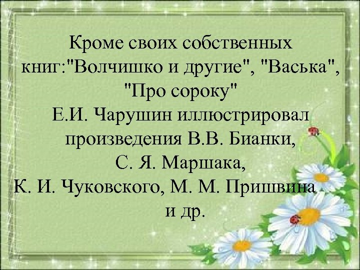 Кроме своих собственных книг: "Волчишко и другие", "Васька", "Про сороку" Е. И. Чарушин иллюстрировал произведения В. В. Бианки, С. Я. Маршака, К. И. Чуковского, М. М. Пришвина и др.
