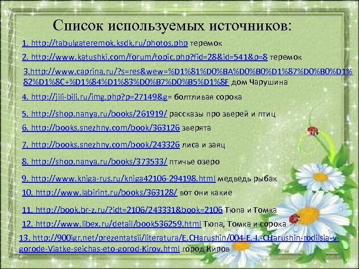 Список используемых источников: 1. http: //tabulgateremok. ksdk. ru/photos. php теремок 2. http: //www. katushki. com/forum/topic. php? fid=28&id=541&p=8 теремок 3. http: //www. caprina. ru/? s=res&wew=%D 1%81%D 0%BA%D 0%B 0%D 1%87%D 0%B 0%D 1% 82%D 1%8 C+%D 1%84%D 1%83%D 0%B 7%D 0%B 5%D 1%8 F дом Чарушина 4. http: //jili-bili. ru/img. php? p=27149&g= болтливая сорока 5. http: //shop. nanya. ru/books/261919/ рассказы про зверей и птиц 6. http: //books. snezhny. com/book/363126 зверята 7. http: //books. snezhny. com/book/243326 лиса и заяц 8. http: //shop. nanya. ru/books/373533/ птичье озеро 9. http: //www. kniga-rus. ru/kniga 42106 -294198. html медведь рыбак 10. http: //www. labirint. ru/books/363128/ вот они какие 11. http: //book. br-z. ru/? idt=2106/243331&book=2106 Тюпа и Томка 12. http: //www. libex. ru/detail/book 536259. html Тюпа, Томка и сорока 13. http: //900 igr. net/prezentatsii/literatura/E. CHarushin/004 -E. -I. -CHarushin-rodilsja-vgorode-Vjatke-sejchas-eto-gorod-Kirov. html город Киров