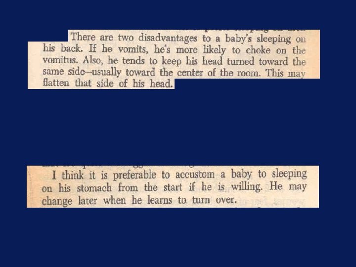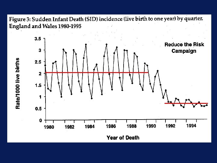 Results of a meta-analysis • Collation of the results of many studies contradict this advice • Extract from publicity prepared for the UK ‘Reduce the Risk’ Campaign (early 1990 s) “The risk of cot death is reduced if babies are not put on the tummy to sleep. Place your baby on the back to sleep. …. Healthy babies placed on their backs are not more likely to choke. ”