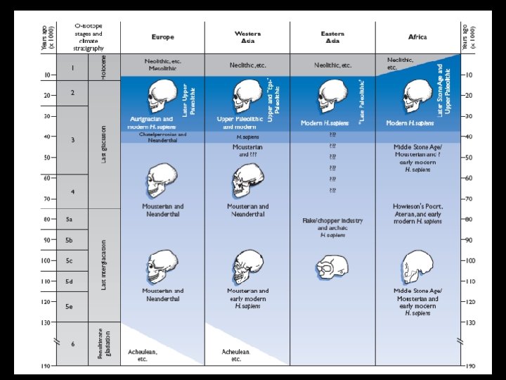 Antiguedad de los fósiles (años antes del presente) Este Africa: Herto 160. 000 -154. 000 Omo 1 195. 000 Laetoli 120. 000 Primeros Homo sapiens anatómicamente modernos Sudáfrica: Border Cave 115. 000 -90. 000 Klasies River Mouth 90. 000 Israel: Skhul & Qafzeh 92. 000 Australia: Lago Mungo 60. 000 - 46. 000 Liujiang Asia: Ordos (Mongolia) 40. 000 -20. 000? Liujiang (China)139. 000 -111. 000? Zhoukoudian (China) 27. 000 Europa: Peştera cu Oase (Rumania) 36. 000 -34. 000 Combe Capelle (Francia) 35. 000 -30. 000 Mladeč & Předmostí (Republica checa) 35. 000 -25. 000 Cro-Magnon (Francia) 27. 000 -23. 000 Lago Mungo