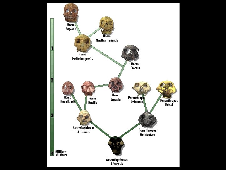 3 Ma Australopitecinos Tiempo Esqueletos y cráneos mas gráciles. cerebro pequeño, dientes postcaninos grandes bípedos, aunque con rasgos primitivos en su esqueleto postcraneal. 4. 8 Ma.