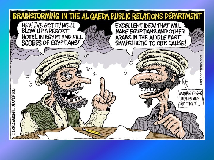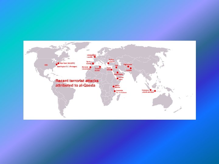 Al Qaeda and Osama bin Laden • Reasons for terrorism against US: – US military presence in Middle East – US support of Israel – Hatred of Western Culture – At war with American “infidels”