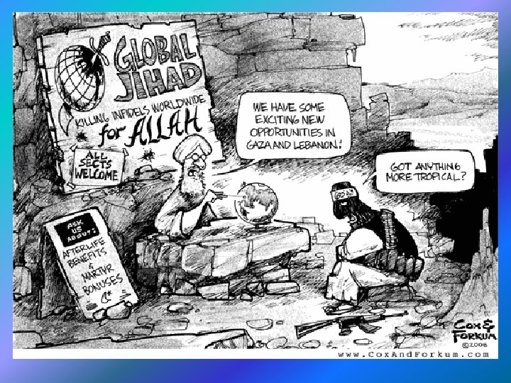 Jihad – Holy War • AQ believes in jihad against infidels (enemies of Islam) • Remove West from Middle East • Re-establish caliphate: Muslim leadership