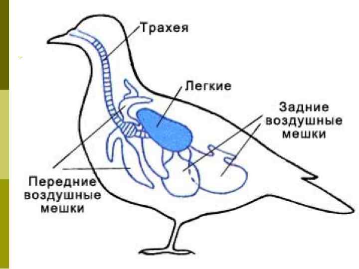 Дыхательная система птиц Парные легкие, которые представляют собой плотные губчатые тела, вторичные бронхи, парабронхы и бронхиолы. Дыхательные пути: ноздри, носовая полость, верхняя гортань, трахея с голосовым аппаратом в нижней гортани, бронхи. Есть воздушные мешки (9 -11), которые обеспечивают двойной тип дыхания.