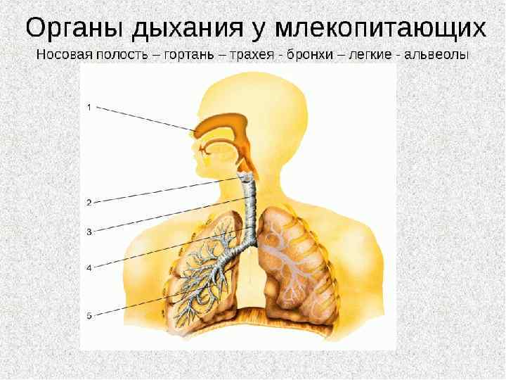 Дыхательная система млекопитающих Парные легкие альвеолярного строения с большой площадью поверхности (превышает площадь поверхности тела в 50 100 раз). Дыхательные пути: ноздри, носовая полость, гортань с голосовыми связками, трахея, главные бронхи, которые разветвляются в легких до бронхиол. Реберный и диафрагмальный тип дыхания. У млекопитающих дыхательные пути, как и у предков, выстланы мерцательным эпителием. Они полностью отделены от пищеварительной системы и только перекрещиваются с ней в глотке. Бронхи многократно разветвляются, вплоть до бронхиол, ведущих в альвеолы — легочные пузырьки, имеющие в сумме огромную площадь поверхности (у человека до 90 м ). Основной мышцей, изменяющей объем грудной полости, становится диафрагма. У млекопитающих в эмбриогенезе начинается закладка глоточных мешков и жаберных карманов, которые в норме никогда не прорываются и не образуют жаберных щелей.