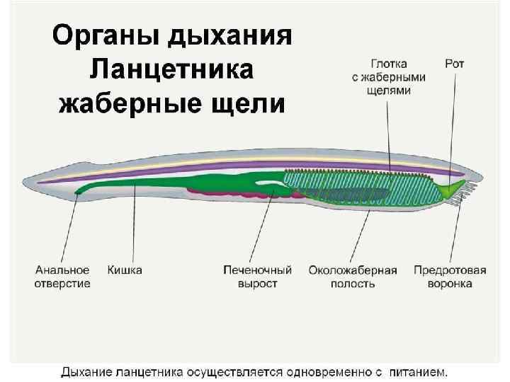 Дыхательная система Ланцетника У ланцетника специализированных органов дыхания нет, а дыхательную функцию выполняет глотка — передняя часть пищеварительной трубки, пронизанная сквозными отверстиями — жаберными щелями (более 150 пар), главной функцией которых является фильтрация воды. Постоянный ток свежей воды через глотку способствует газообмену в кровеносных сосудах, расположенных в жаберных перегородках. На капилляры эти сосуды не распадаются, что свидетельствует о второстепенности дыхательной функции глотки.