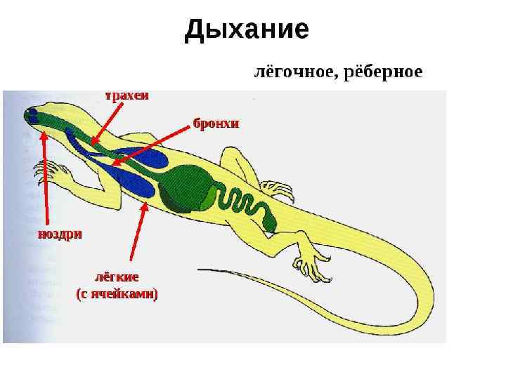 Дыхательная система пресмыкающихся Парные легкие, которые представляют собой тонкостенные ячеистые мешки с большим количеством внутренних перегородок. Дыхательные пути ноздри, гортань, трахея два бронхи. Реберный тип дыхания. Пресмыкающиеся, вышедшие на сушу окончательно, имеют как верхние дыхательные пути (не полностью отграниченную от ротовой полостиполость носа), так и нижние — гортань, трахею и бронхи. Их легкие мелкоячеисты, содержат многочисленные внутренние перегородки и обладают большой дыхательной поверхностью. Впервые появляется диафрагма, которая в дыхании принимает скорее пассивное участие, так как она либо лишена мышечных элементов, либо разделяет грудную и брюшную полости не полностью. Механизм дыхания основан на сокращении межреберных мышц, приводящих в движение грудную клетку. У пресмыкающихся прорыв жаберных щелей происходит только в эмбриональном развитии; вскоре после этого они зарастают.