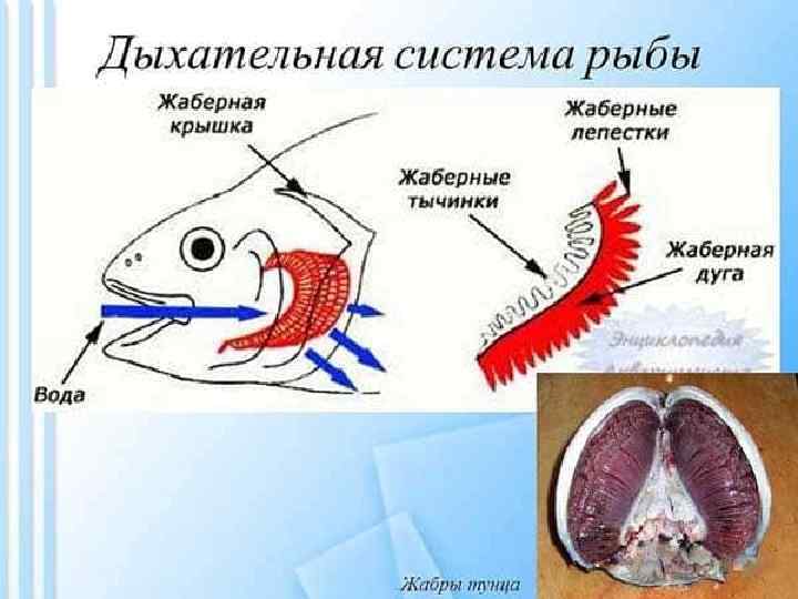 Дыхательная система рыб Жабры. Также есть и дополнительные органы для дыхания атмосферным воздухом: легкие (двоякодышащие рыбы), лабиринтный орган (аквариумные рыбки Макроподы), участки ротовой полости, глотки и задней кишки, плавательный пузырь. Жабры — наиболее ранние специализированные органы дыхания, появляющиеся среди хордовых впервые у рыб. Они представляют собой тонкие складки слизистой оболочки глотки, лежащие на жаберных дугах, снабжаемые венозной кровью через жаберные артерии и распадающиеся здесь на капилляры. Позади последней жаберной дуги у кистеперых рыб за счет выпячивания вентральной стороны глотки формируется парное образование — плавательный пузырь, который выполняет в первую очередь гидростатические функции, уравновешивая тело рыбы в толще воды. Связь между ним и глоткой, имеющаяся в эмбриогенезе, не прерывается и позже, поэтому воздух при попадании в глотку может беспрепятственно проходить в плавательный пузырь.
