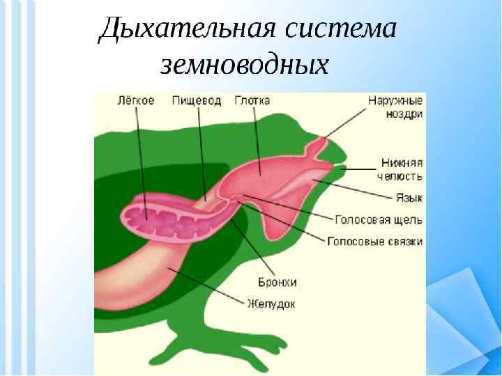Дыхательная система земноводных Имеется четыре способа дыхания: легочное (у взрослых особей есть парные легкие, которые представляют собой тонкостенные ячеистые мешки с малойповерхностью), кожное (кожа содержит большое количество кровеносных сосудов), ротовое (диффузия газов через ротовое эпителий) жаберное (уличинок). Дыхательные пути: ноздри, ротовая полость, трахейно-гортанная камера. У земноводных, связанных по происхождению с кистеперыми рыбами, в личиночном состоянии функционируют жабры, а во взрослом — органами дыхания становятся легкие. В связи с отсутствием грудной клетки и диафрагмы воздух в них попадает из ротовой полости за счет глотательных движений, осуществляющихся подбородочно-подъязычной мышцей. Материал жаберных дуг, следующих за подъязычной дугой, частично редуцируясь, входит в состав хрящей гортани, которая, появляясь впервые у земноводных, является первым органом, относящимся к нижним дыхательным путям.