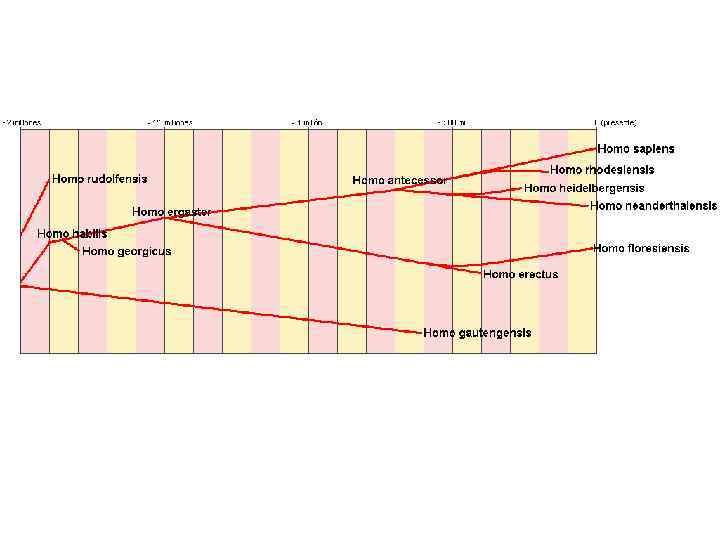 Число находок Открытие / публикация названия 1, 000 2 стоянки 1997 1, 000 1 крышка черепа 1994/2003 850 (ран. ) – 1, 100 (позд. ) множ. 1891/1892 700– 850 множ. 1975 400 7 особей 2003/2004 1 особь 2010/2010 600 4 оооби 1999/2002 В И ДЫ А Р Е А Л Рост Вес Объем черепа взрослого (cm³) H. antecessor Испания 1. 75 м H. cepranensis Италия H. erectus Африка, Ява, Китай, Индия, Кавказ 1. 8 м H. ergaster Вост. и Зап. Африка 1. 9 м H. floresiensis Индонезия 1. 0 м H. gautengensis Юж. Африка 1. 0 м H. georgicus Грузия H. habilis Африка 1. 0– 1. 5 м 33– 55 кг 510– 660 множ. 1960/1964 H. heidelbergensis Европа, Африка, Китай 1. 8 м 60 кг 1, 100– 1, 400 множ. 1908 1. 6 м 55– 70 кг 1, 200– 1, 900 множ. (1829)/1864 1, 300 незнач. 1921 1 череп 1972/1986 3 черепа 1997/2003 H. neanderthalensis Европа, Зап. Азия H. rhodesiensis Эфиопия H. sapiens (совр. ) повсеместно 25 кг Кения H. sapiens idaltu 60 кг Замбия H. rudolfensis 90 кг 1, 450 1. 4– 1. 9 м 50– 100 кг