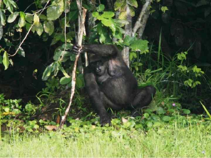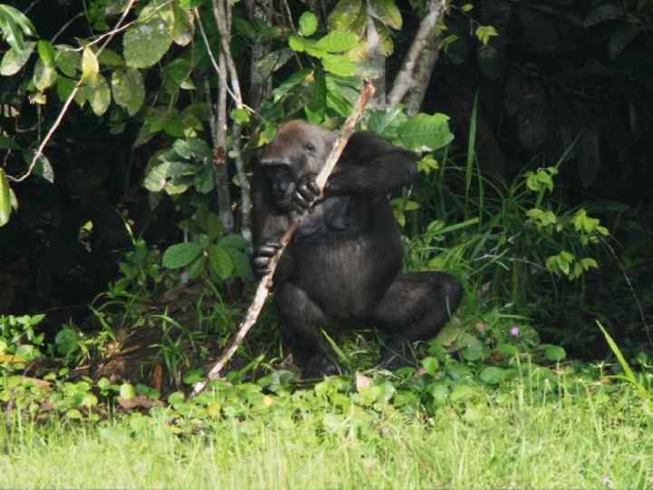Прямохождение у человекообразных обезьян Слева: Орангутан (Pongo); справа: Горилла (Gorilla), Нац. парк Ноуабале-Ндоки, Конго. Горилла использует палку для измерения глубины воды, а также для добычи водных растений.